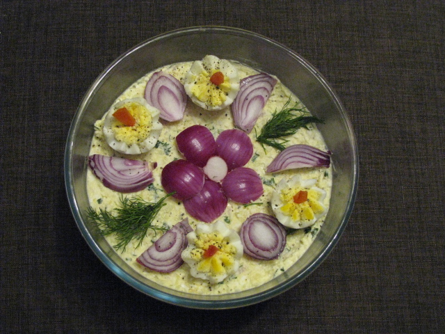 Doprawić pieprzem, solą, dodać wystudzoną cebulę, pokrojoną natkę, posypać odrobiną kurkumy.